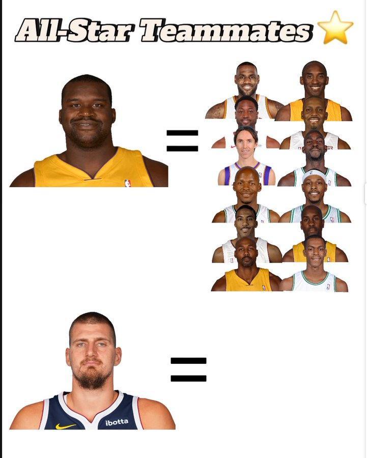 直播吧8月25日讯 今天,掘金自媒体@The Lakers Daddy对比了约基奇和奥尼尔全明星队友的数量。